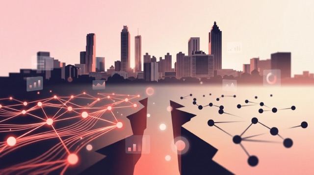 Atlanta skyline with Midtown and Buckhead visible, abstract AI recommendation network showing unknown competitors rising in the foreground